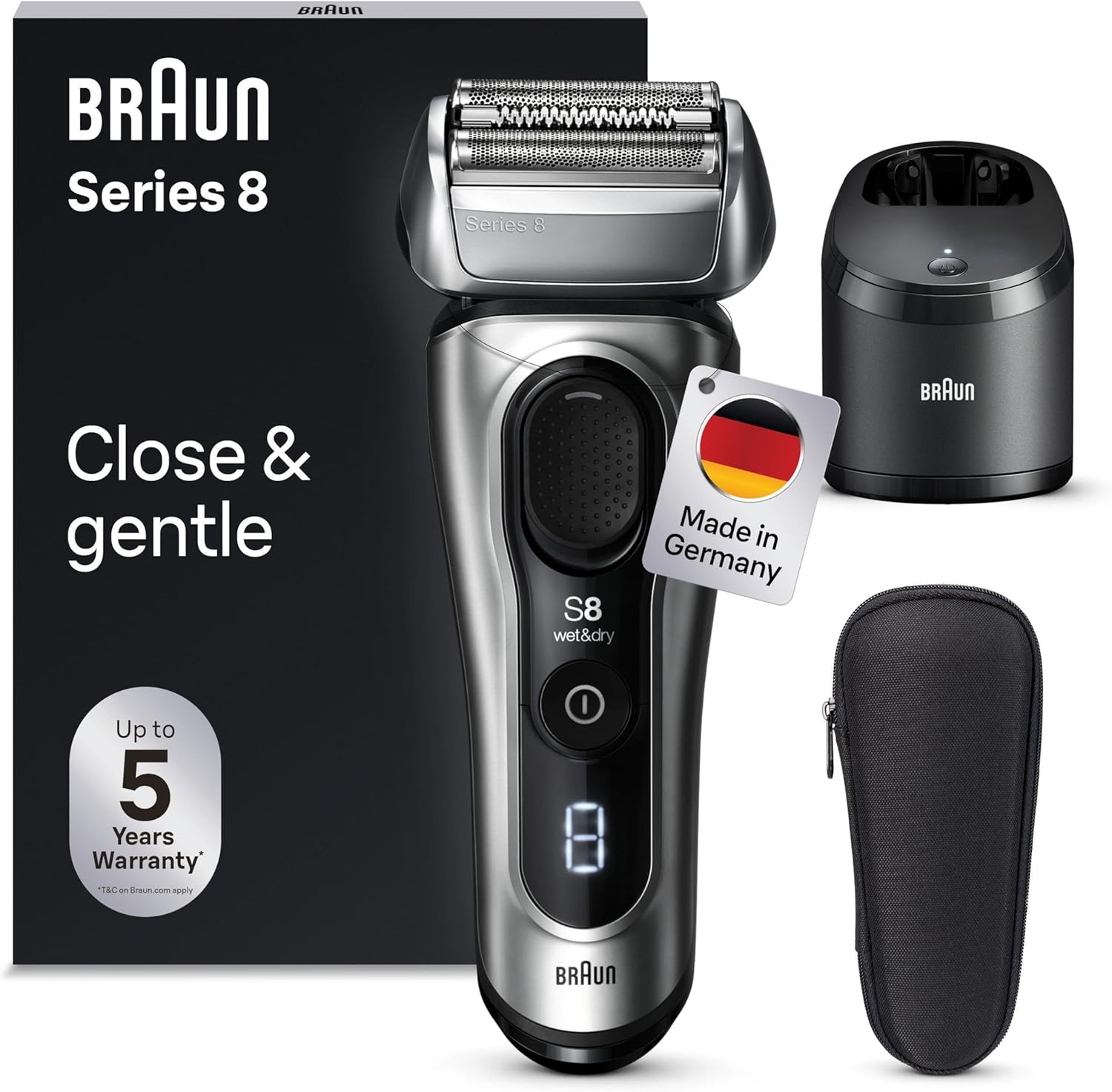 Braun Series 8 Rasierer Herren mit 41 Scherkopf, Elektrorasierer, Präzisions - Langhaarschneider, Reinigungsstation, 60 Min Laufzeit, Wet und Dry, Made in Germany, 8567cc, silber